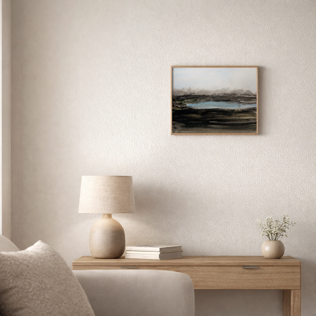 The fields will wake up The image shows a gloomy landscape with blurred lines. and softly diffused shapes, evoking an atmosphere of mist or morning fog. The palette features dark shades of black and gray contrasted by sparse touches of blue and green-yellow, creating a rhythmic yet calm visual impression. Style: Impressionistic Mood: Cozy, melancholic