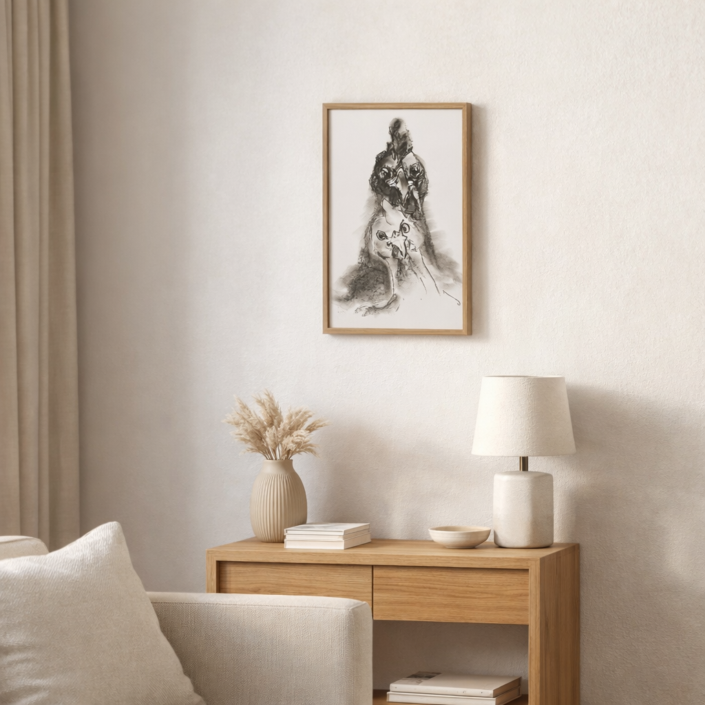 Reliable Support is a painting about trust, support, and inner strength. It depicts two birds symbolizing unity and mutual care. One represents protection and confidence, while the other reflects calmness and faith. Together, they create a sense of harmony where everyone can find a reliable support. The artwork conveys warmth, connection, and the importance of having someone by your side in life’s key moments. This unique drawing depicts two birds in a stylized manner. The figures are somewhat blurred but clearly convey distinctive avian features such as beaks and eye expressions. Dark charcoal and blurred black tones create a strong contrast against the light background, emphasizing the shape and dynamism of the images. The lines have an uneven, energetic quality, giving the composition a sense of movement and vitality. Style: Expressionism Mood: Mysterious, contemplative
