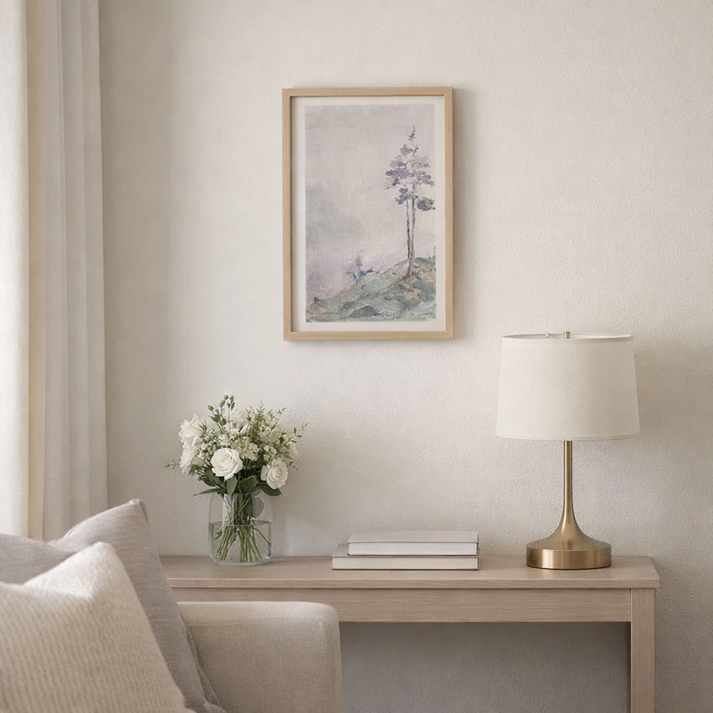 Cold fogs The painting depicts a tranquil landscape featuring a single tall tree standing atop a gentle hill. The soft and diffuse surrounding space evokes a sense of calm and solitude, emphasizing the delicate form of the tree. The color palette consists of muted grays, blues, and light purples, blending harmoniously with smooth transitions and rhythmic brushstrokes. The overall effect induces a meditative and serene atmosphere. Style: Impressionism Mood: calm, contemplative