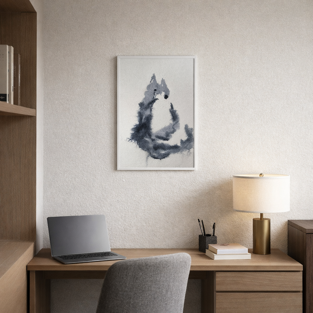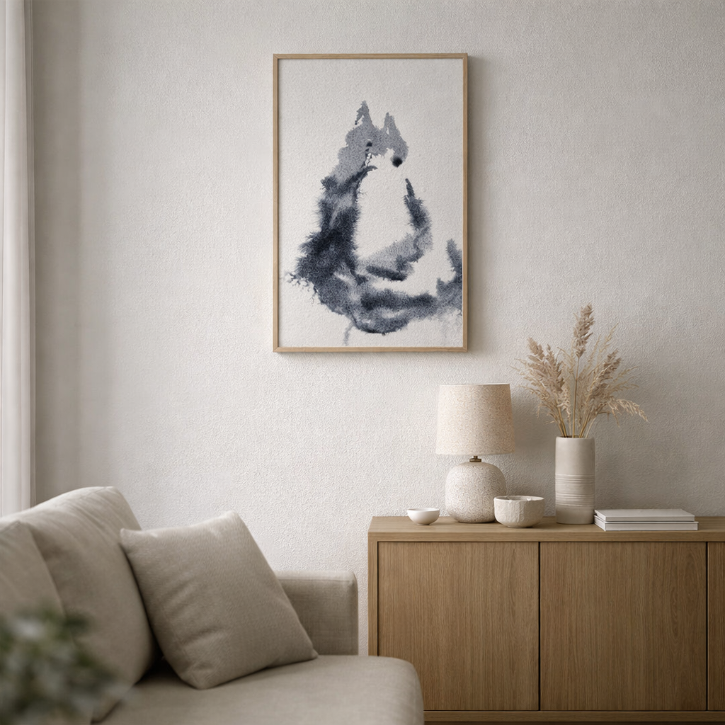 A minimalist watercolor painting of a seated dog, created with fluid, expressive brushstrokes. The soft monochrome washes and organic textures give the figure a quiet presence, capturing both strength and gentleness in a spontaneous gesture.