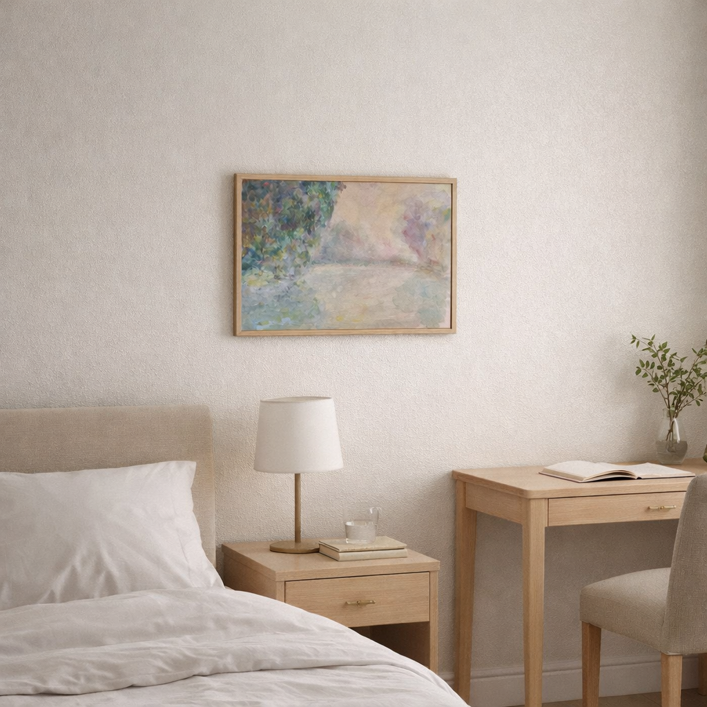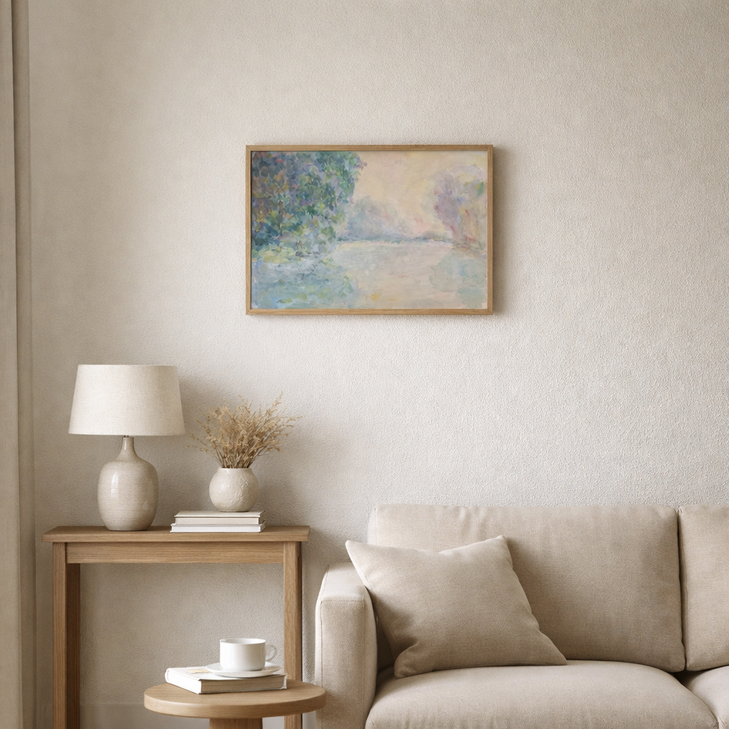 Sunrise The artwork depicts a serene natural scene with blurred outlines of trees and water surface. The composition conveys a calm atmosphere as if a morning mist envelops the shore. The color scheme features soft pastel hues of blue, green, and pink. The forms are diffused, creating an emotional rhythm and visual softness. The interplay of colors and lines evokes a shimmering light and airy effect. Style: Impressionism Mood: tranquil, contemplative