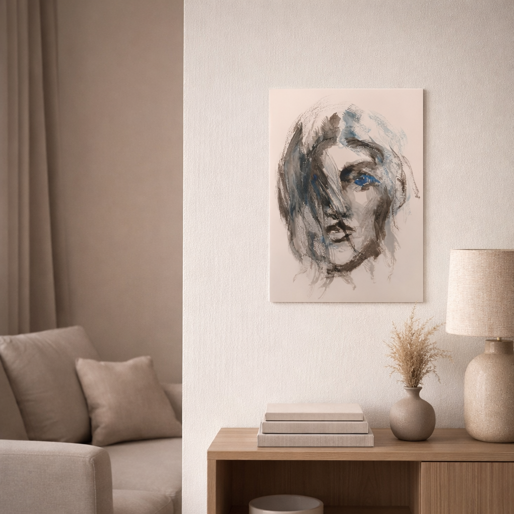 “Hayloft” is an expressive portrait that captures an inner emotional state through movement and dissolving forms. The face seems to fade into brushstrokes, revealing feelings that are difficult to put into words. The blue eye becomes the focal point — a symbol of depth, memory, and the inner world. The contrast of strokes creates both tension and fragility. The color palette is dominated by dark tones with splashes of blue highlighting the eyes and adding focal points to the composition. Lines and shapes interact in a rhythmic chaos, enhancing the emotional impact of the image. Style: Expressionism. Mood: mysterious, emotional.