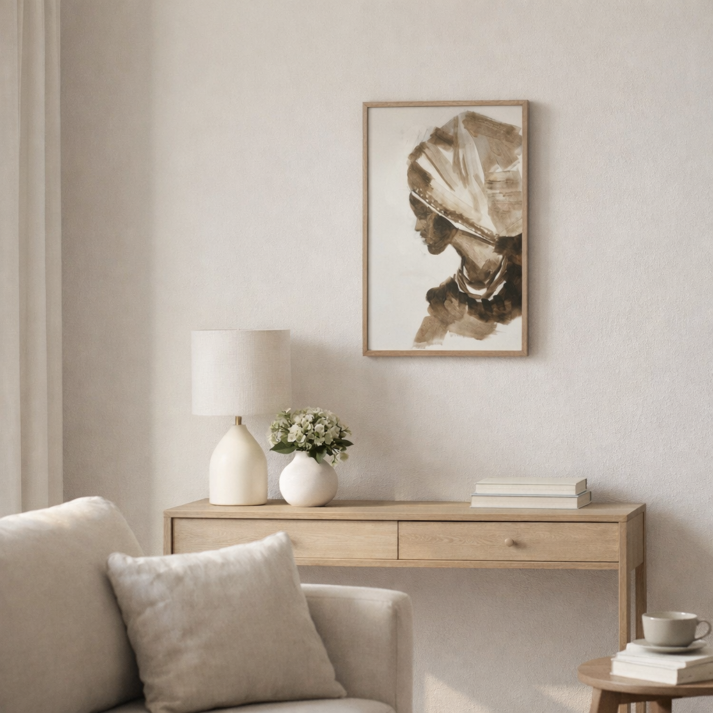 A foreigner This artwork depicts the profile of a woman rendered with loose, soft brushstrokes that evoke a sense of calm and contemplation. The figure appears delicate, with a well-defined silhouette and subtle suggestion of a traditional headwrap. The composition is dominated by earthy brown tones on a light background, blending smoothly to emphasize form and depth. The contrast of tones and rhythmic alternation of light and dark areas add a dynamic yet tender quality to the piece. Style: Impressionistic Mood: calm, reflective