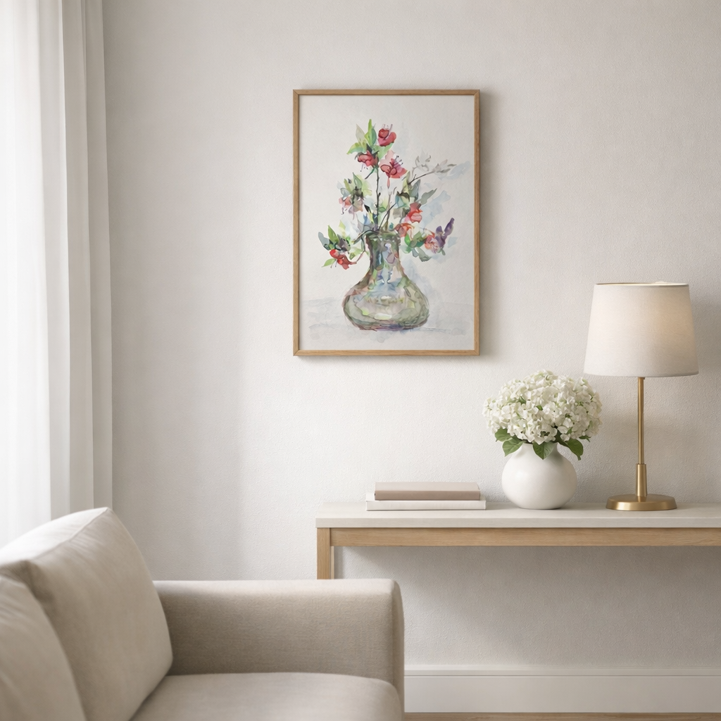 Floral still life in a transparent vase. A delicate watercolor depiction of flowers and leaves placed in a clear vase. The composition is filled with fine brushstrokes conveying lightness and ethereal form. Rich red flowers contrast beautifully with green leaves and the transparent, almost weightless vase, creating a harmonious visual rhythm and airiness. Style: watercolor impressionism Mood: light, calm