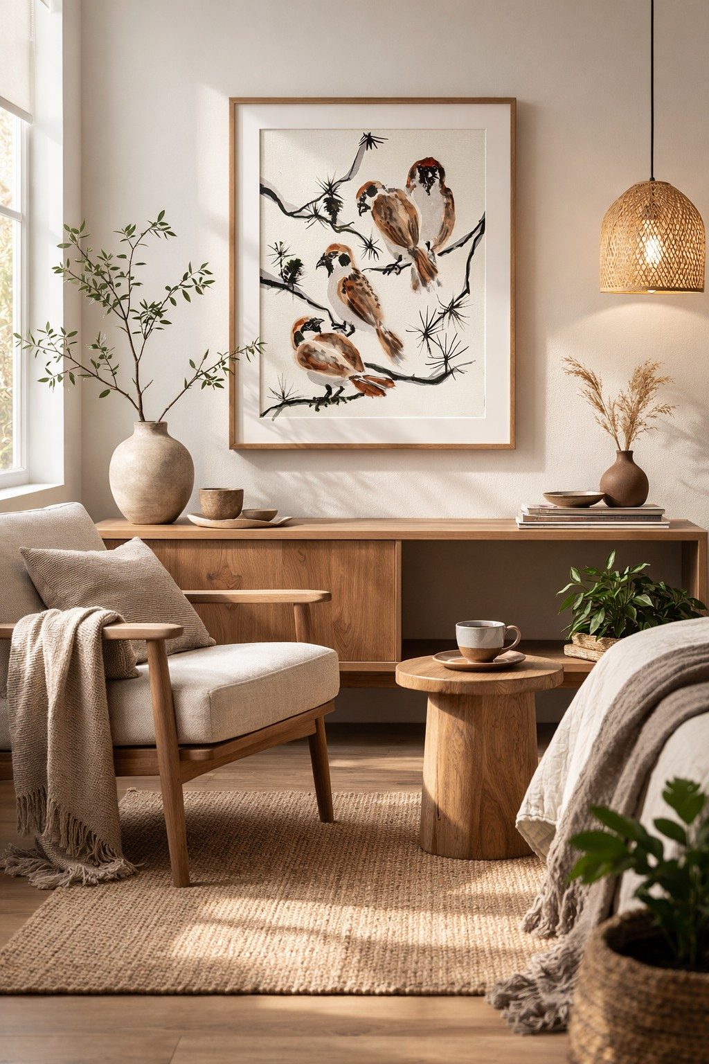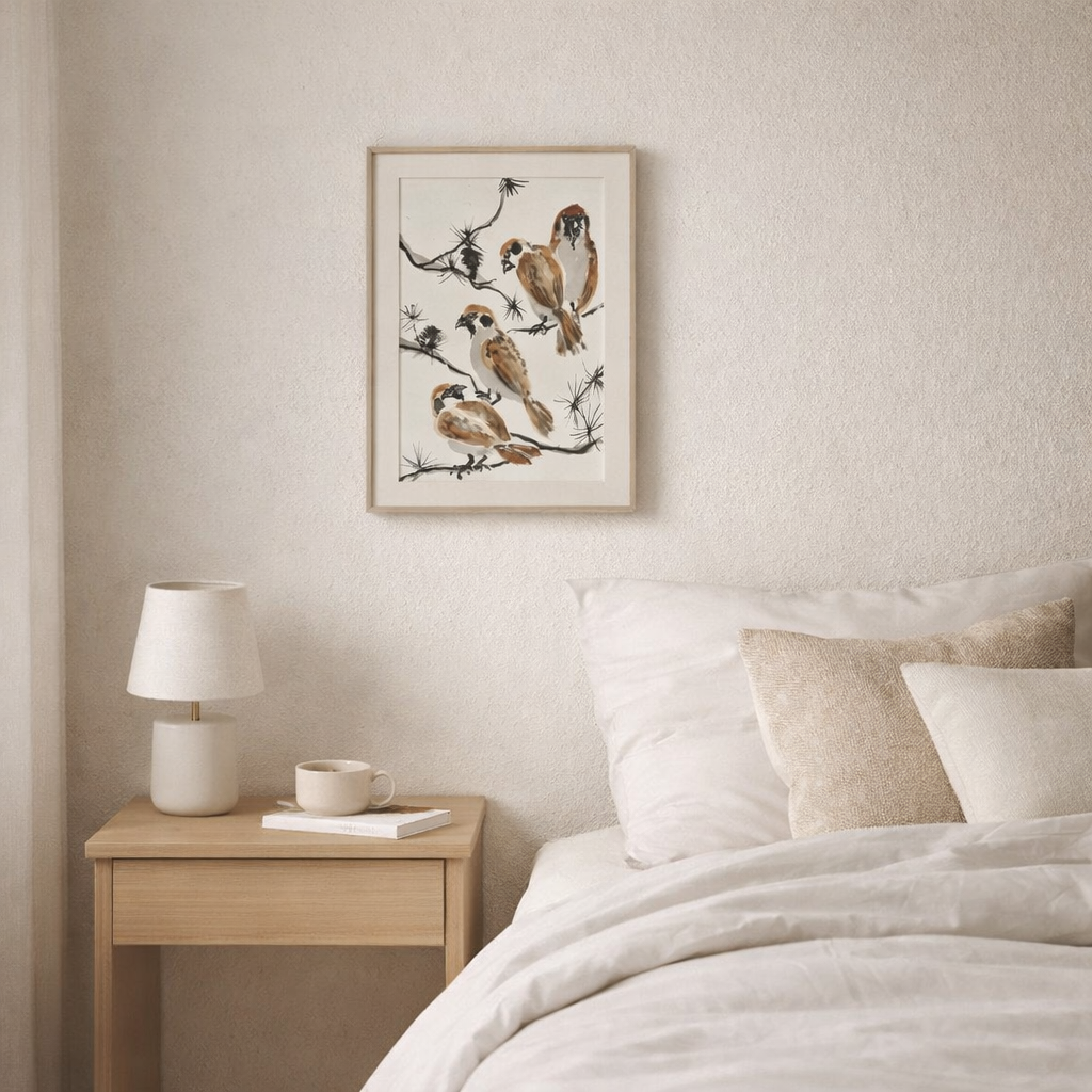 Sparrows on a Branch This watercolor artwork is created in a traditional Eastern-inspired style with light, expressive brushstrokes. Three sparrows resting on delicate branches evoke a sense of calm, warmth, and natural harmony. The soft brown tones of the birds contrast beautifully with the graphic black lines of the branches and pine needles. The painting captures the quiet poetry of everyday nature and would complement minimalist, Scandinavian, or Japanese-style interiors. Style: Minimalism, Eastern aesthetics Mood: Calm, warmth, harmony