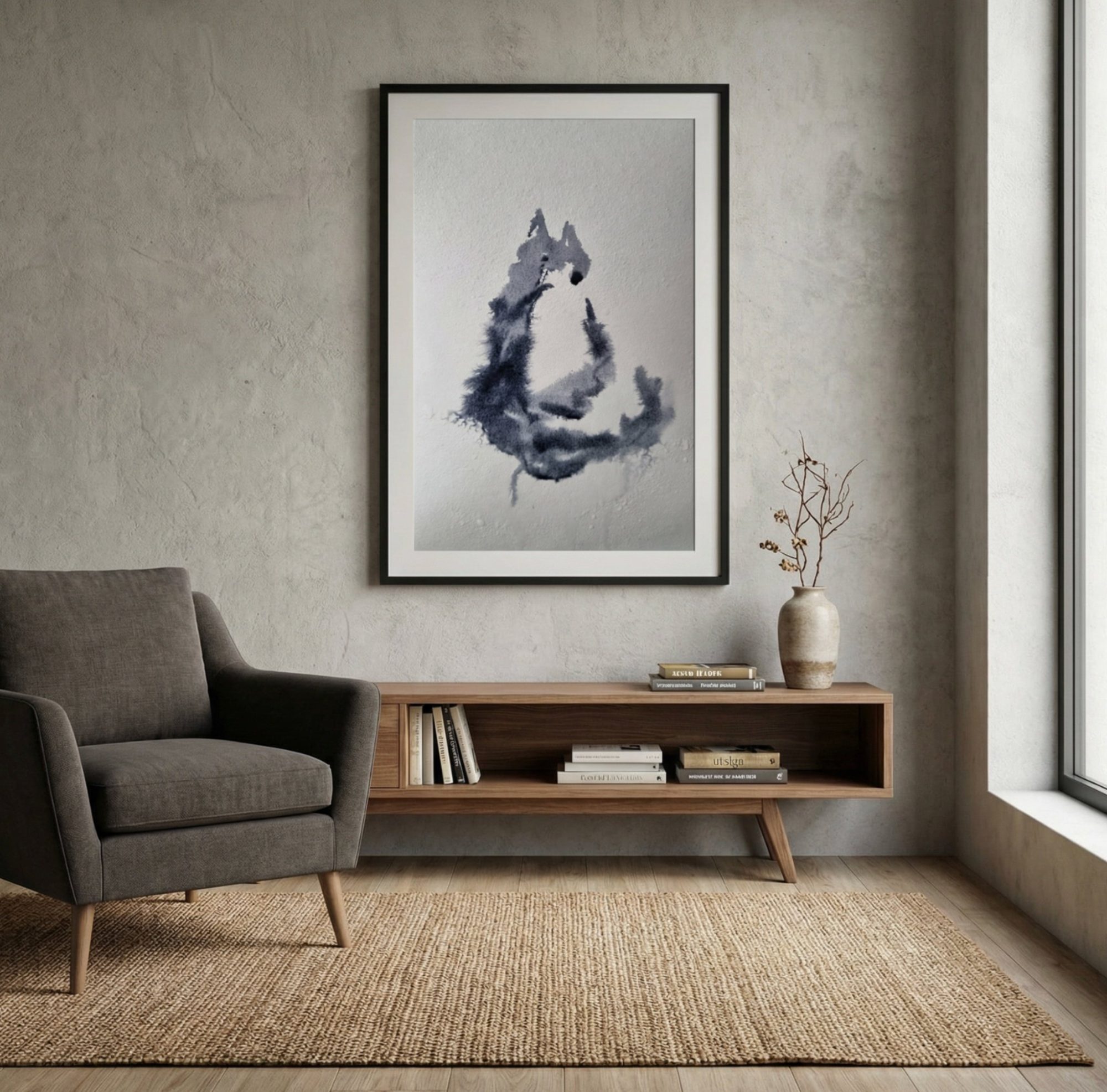A minimalist watercolor painting of a seated dog, created with fluid, expressive brushstrokes. The soft monochrome washes and organic textures give the figure a quiet presence, capturing both strength and gentleness in a spontaneous gesture.