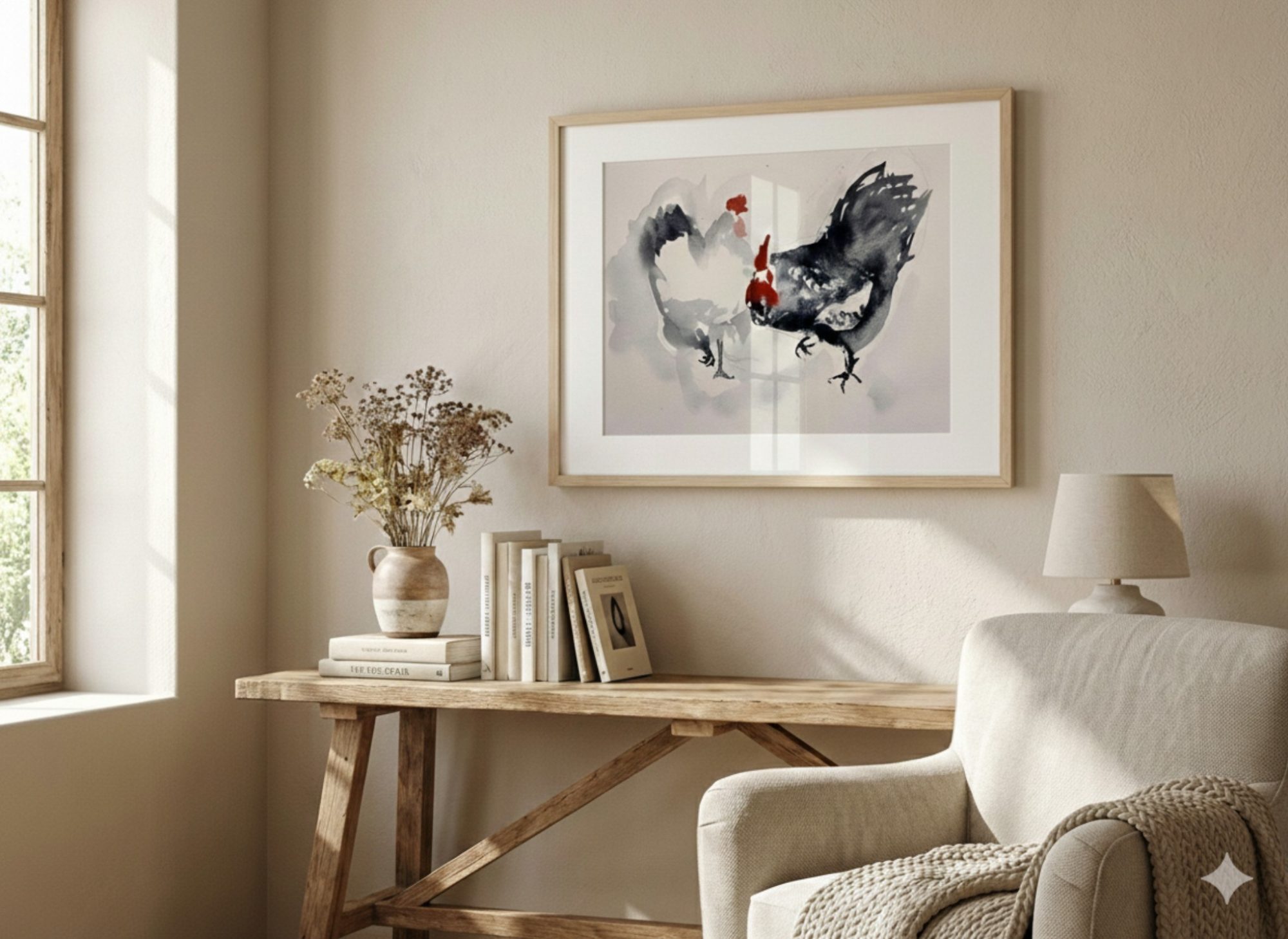 Rooster and Hen An expressive watercolor artwork created in a свободной, minimalist manner. The contrast between soft light washes and deep black tones, enhanced by bold red accents, brings movement and character to the composition. The painting captures natural strength and interaction while maintaining the lightness and transparency typical of watercolor. A harmonious blend of traditional motifs and contemporary expression makes it a striking focal point in modern interiors. Style: Minimalism, Eastern-inspired aesthetics Mood: Energy, balance, natural harmony