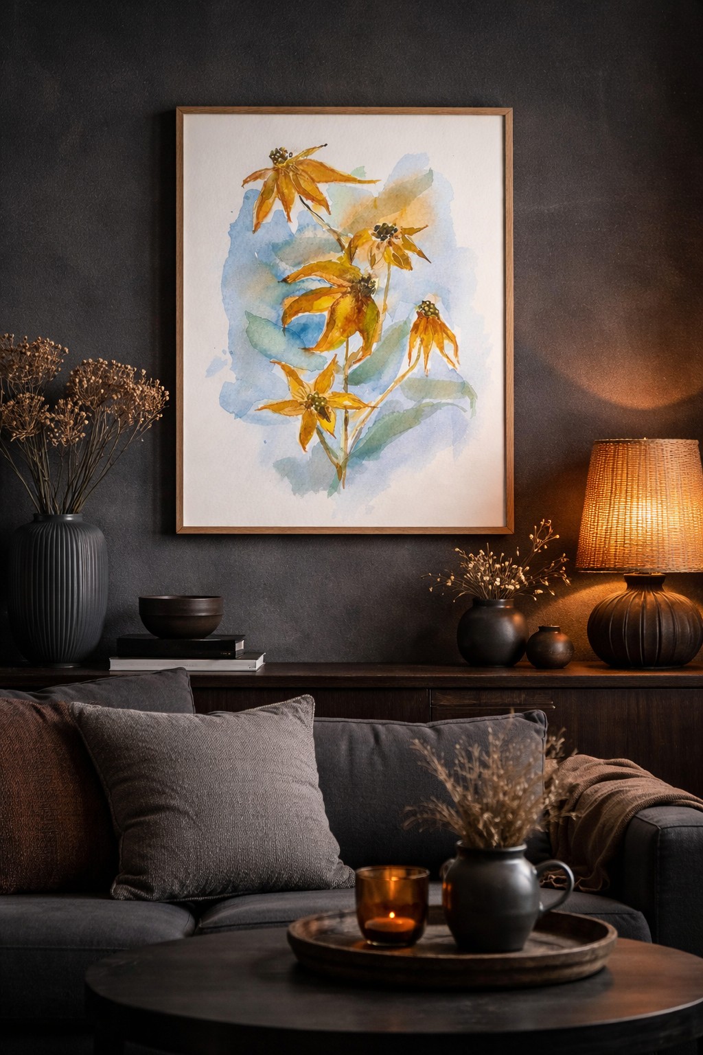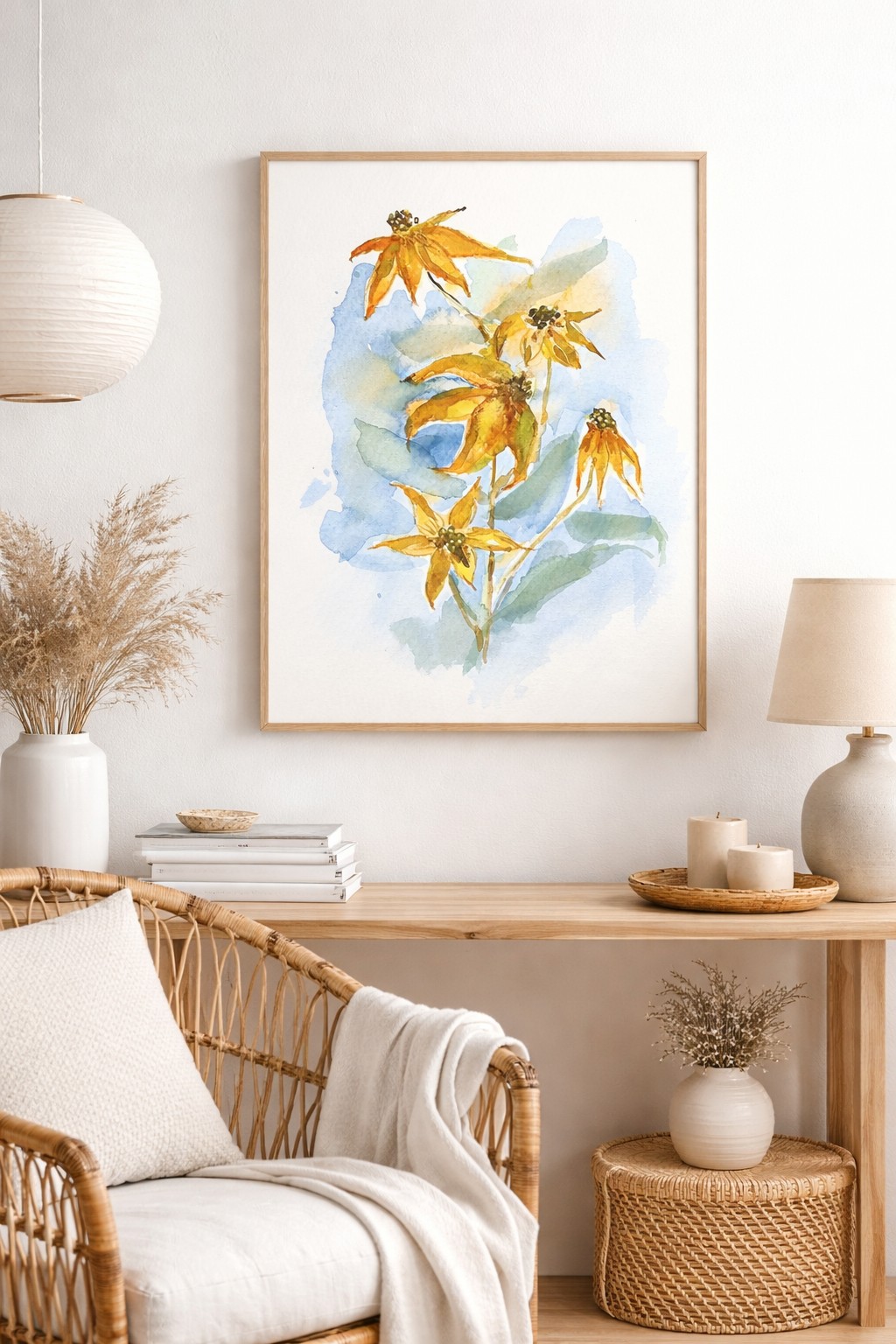 Yellow Flowers in Watercolor The image depicts a delicate composition of yellow flowers painted in watercolor technique. The flowers with slender petals stand out against a light background, creating a sense of lightness and airy painterliness. The shades of yellow in the flowers harmoniously contrast with the blue and green accents in the background and leaves. The rhythm of flower placement and the softness of lines emphasize natural harmony and balance in the composition. Style: Watercolor Impressionism Mood: Lightness and tranquility